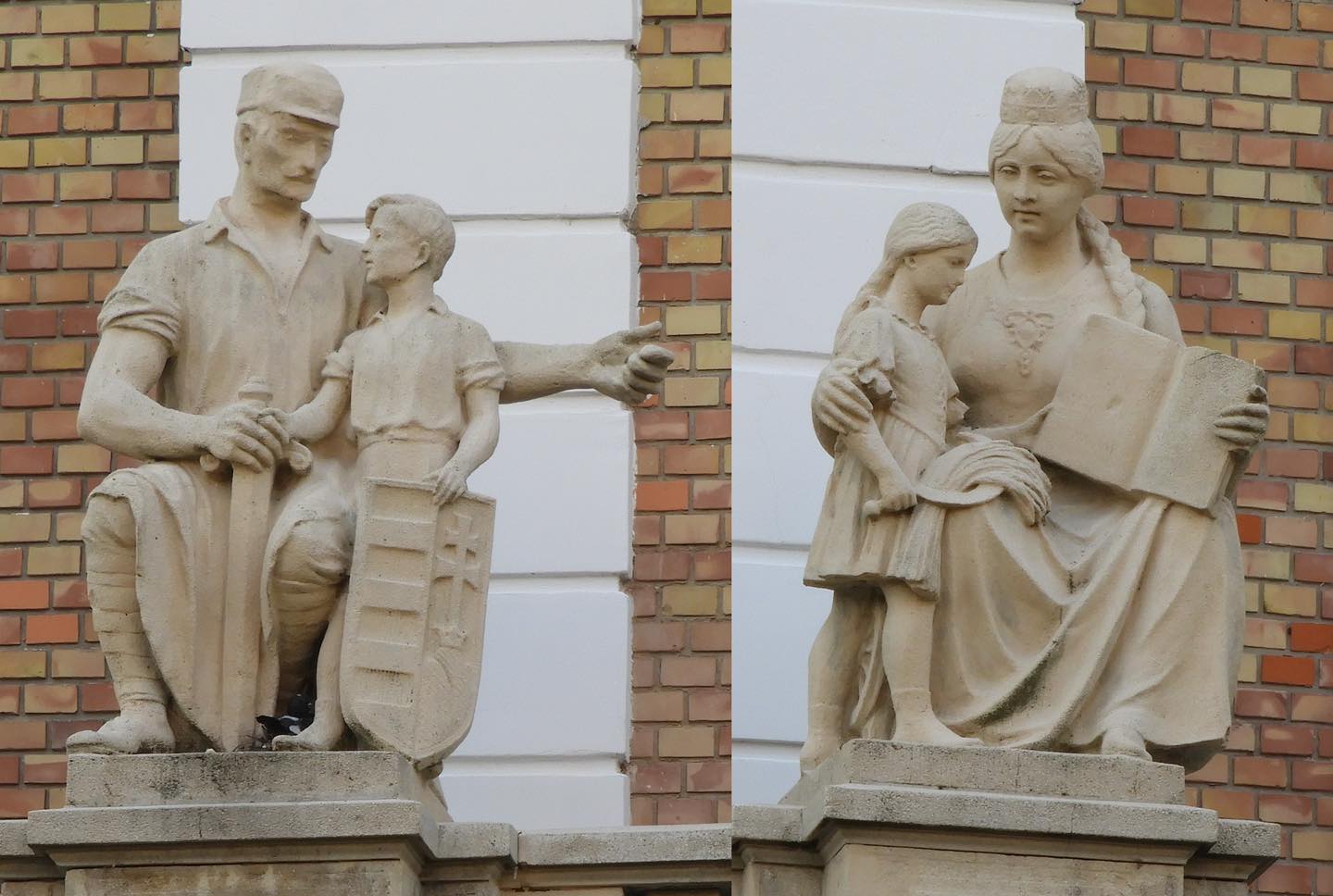 - Férfialak kisfiúval: A férfi kezében kard, a fiú kezében címer látható. A kompozíció a hazaszeretetet, a védelem felelősségét és a nemzeti identitás továbbadását fejezi ki.